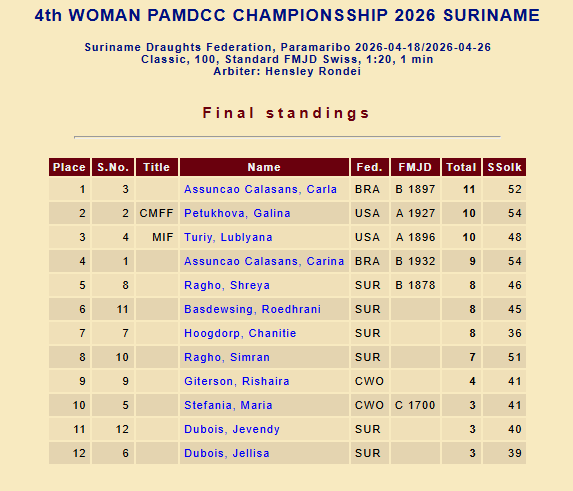 Classificação final do 4º Pan-Americano Feminino 2026, no Suriname. Fonte: FMJD. 2026.
